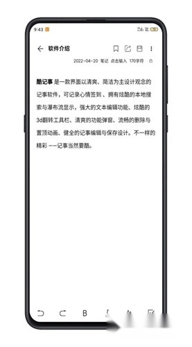 酷记事是一款简单好用的记事本软件,界面简洁大方,用户可以随时记录生活中的重要事项、撰写日记,还能对记录内容进行分类整理,充分满足工作和学习上的需求。