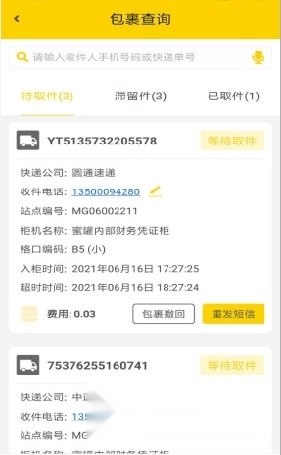 1、滞留件、待取件、已取件的信息都能在手机上随时查询,方便用户及时了解包裹的最新状态。