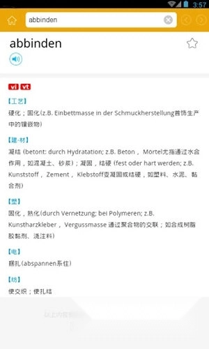 《德汉科技大词典》是一款电子版德汉词典,专为德语学习者提供便捷的查词服务。词典收录了海量词条翻译信息,覆盖自然科学与应用科学的各个领域,词条数量多达上万条。学习者可实时在线查词学习,让德语学习变得更加轻松简单——在学习过程中随时使用词典,输入汉语或德语即可一键查询,满足学习需求,享受高效便捷的学习体验。此外,词典还提供大量单词的音频资源,结合查询内容可播放纯正德语发音,帮助学习者掌握标准德语发音、练习单词,提升德语学习能力。有需要的朋友不妨立即开始使用吧!