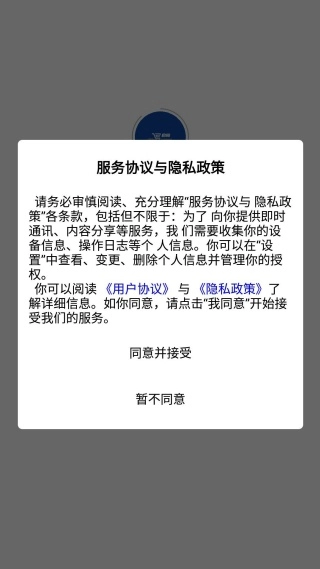 1、后打开软件,提示同意与否,点击同意进入;
