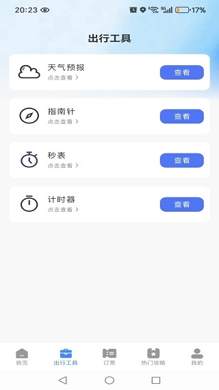 2、出行工具模块整合了气象预报、计时器、秒表等实用功能