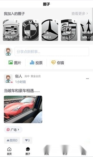 含有广场和话题,不同的汽车会有独立的圈子以及好友。