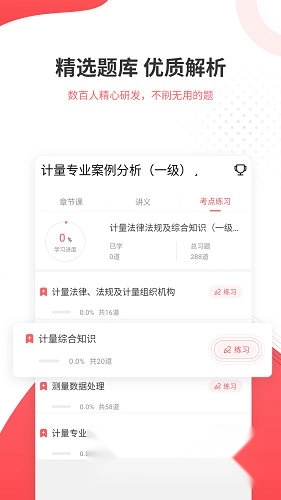一二级计量师准题库是一款专为计量师备考打造的专业学习软件。平台提供全面的题库资源,您可自由选择试题练习,通过规律学习助力轻松备考,提升考试通关几率。此外,这里设有章节视频课程,支持自由选择观看,还可缓存所需视频,离线状态下也能随时学习。平台会推送历年真题,您可查看所有真题并及时练习,掌握更多题型。同时,系统实时统计错题,您能随时查看并复习错题,补充知识点漏洞。页面还设有考试倒计时功能,帮助您充分规划备考时间。