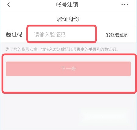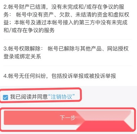 在【账号注销】界面,勾选相关协议后,点击【下一步】按钮。
