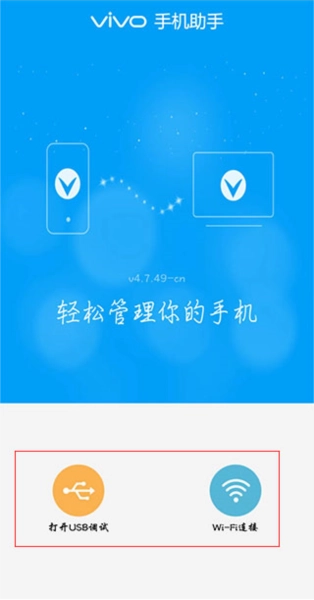 2、若要通过数据线连接,可点击【打开USB调试】按钮;若电脑与设备处于同一WiFi网络环境下,则选择【Wi-Fi链接】
