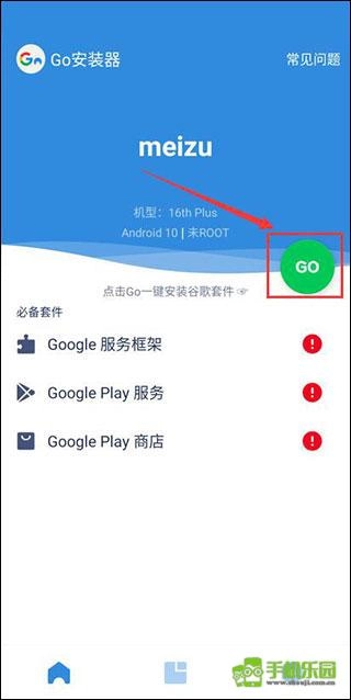 1、软件启动后会自动检测谷歌三件套的状态,缺失的谷歌套件会在对应位置标注红色感叹号,此时用户只需点击右侧的绿色GO按钮,稍作等待就能完成安装。