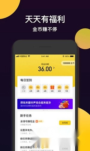 1、设置电话视频铃声赚金币,每天可以提现。