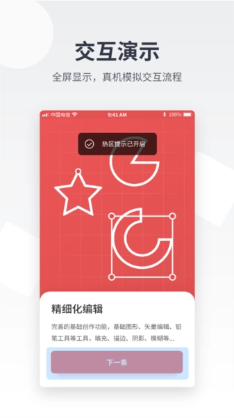 3、交互演示:全屏显示,真机模拟交互流程;