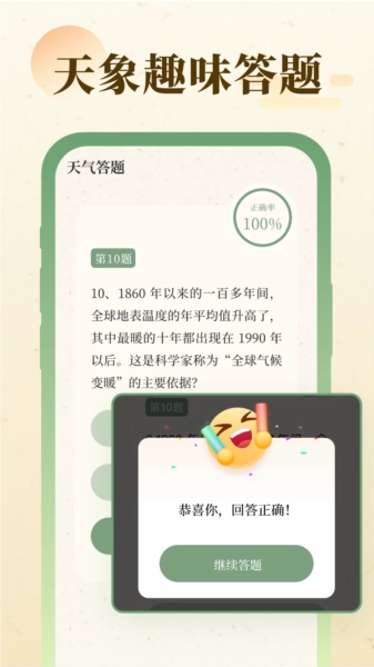 风雨天象配备了趣味答题功能,用户在了解天气的过程中,还能收获更多知识与乐趣。