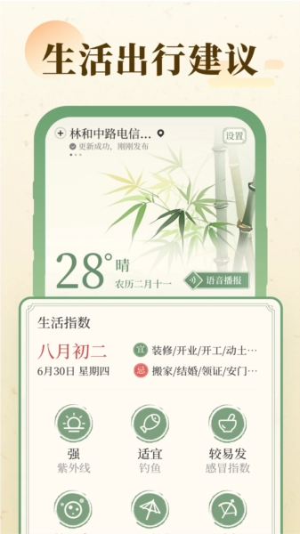 提供出行指引、穿搭建议、紫外线提示、洗车参考等生活服务,助力用户更合理地规划日常安排。