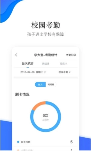 【校园考勤服务】支持学生到校离校刷卡实时推送提醒,提供月日历考勤视图查询,可查看月度考勤统计与详细记录,以及周度考勤统计与明细信息。