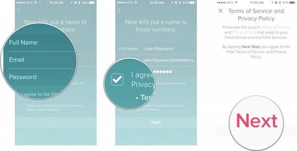 4、在你同意这些条款后,会跳转至下一个窗口进行腕带配对,点击“下一步”,接着等待移动设备与腕带建立连接,之后输入Fitbit屏幕上显示的代码即可。