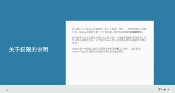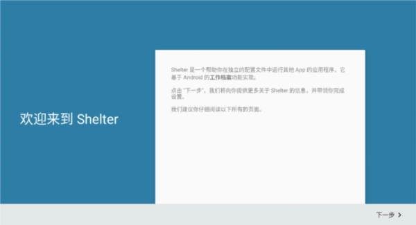 Shelter需要借助Android的“工作配置文件”功能,所以第一次使用时得进行工作配置文件的设置。