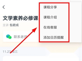 6、点击右上角的三点图标,可实现课程分享、查看课程介绍以及将课程添加至日历提醒等功能。