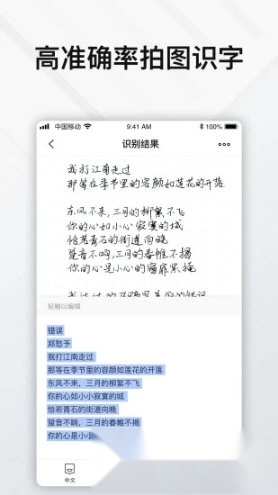 1、精准识别图片中的文字,具备高准确率,可支持中文、英文、法语等多种语言。
