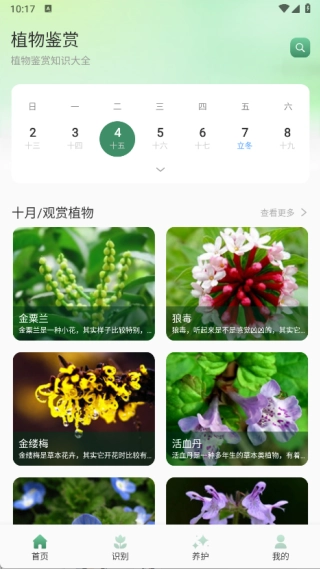 1、首页设有植物鉴赏板块,并且每月推荐的观赏植物都会有所不同。