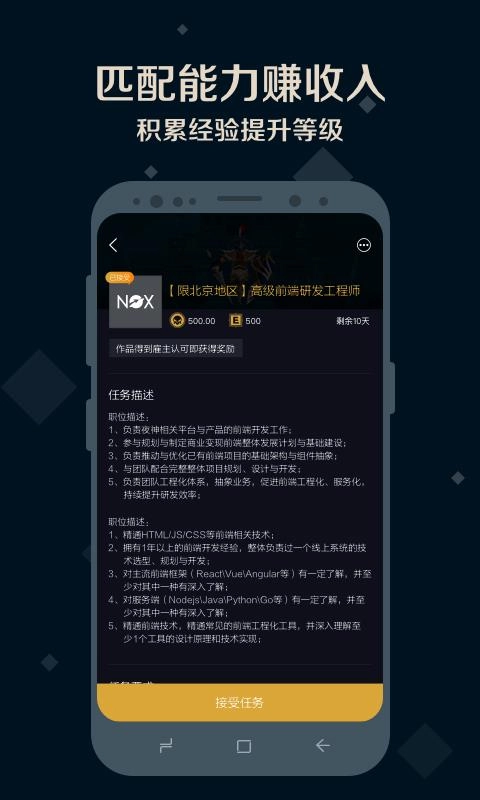 自由职业者可以在夜神猎人App里挑选设计、文案、技术等各类匹配任务来完成,以此获取收益,工作不受地点和时间的约束,能自由安排工作节奏。