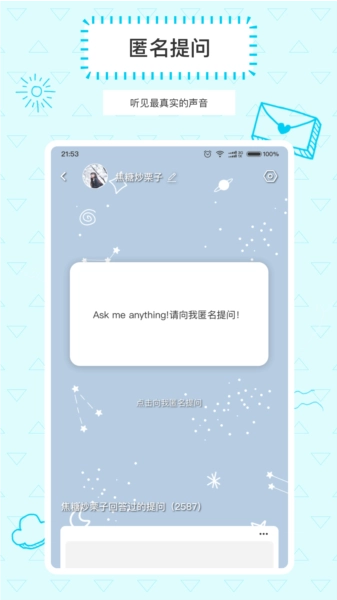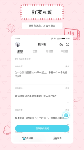 askbox提问箱是一款采用匿名互动问答模式的社交应用,它有着简洁清新的界面,能让用户随时发起匿名提问,在享受趣味问答体验的同时,个人隐私也能得到安全保障。这款应用不仅支持好友间的互动,还具备个性化模板使用功能,用户可以根据自身需求自由编辑设计,从而增强参与感与即时反馈,有效提升社区活跃度。askbox提问箱专门为用户打造了一个轻松又安全的匿名问答平台,其界面简洁明快、操作简便,为用户带来了全新的互动体验。在软件里,用户能够轻松创建属于自己的提问箱,将链接分享给朋友或社交平台,以此实现与好友间有趣的匿名互动。