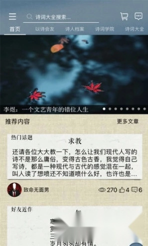 3、以诗会友:支持粉丝互动与实时聊天功能,用户可进行点赞评论、关注收藏操作,也能发表文章和话题。