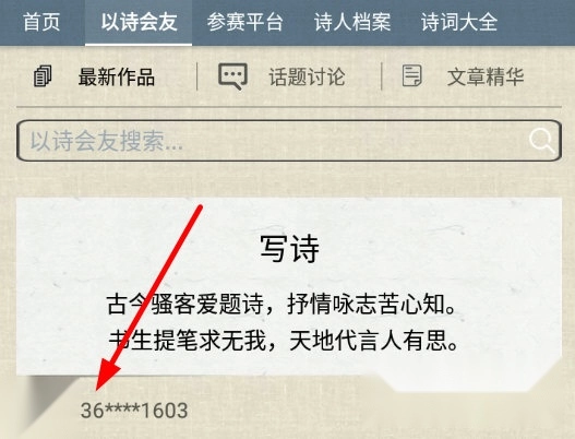 1、在“诗词中国”平台的“以诗会友”板块界面中,我们点击某一位用户。