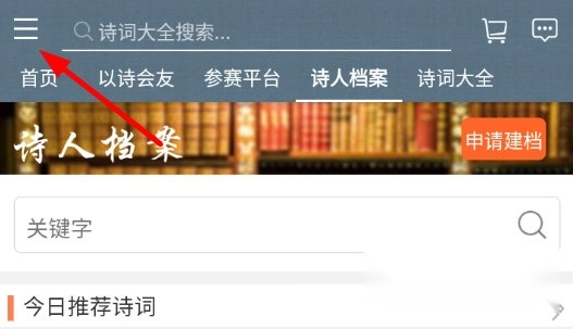 1、在诗词中国的任意界面,点击左上角的“三横杠”图标。