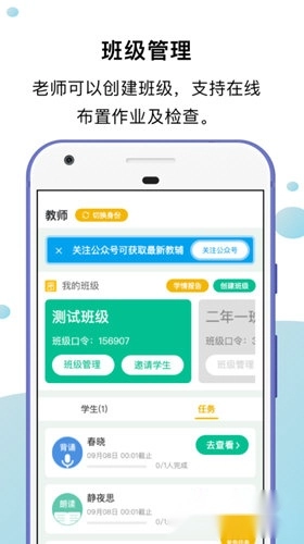 4.教师能够创建班级,集中发布朗读与背诵类作业,以此提高教学效率并便于班级管理。