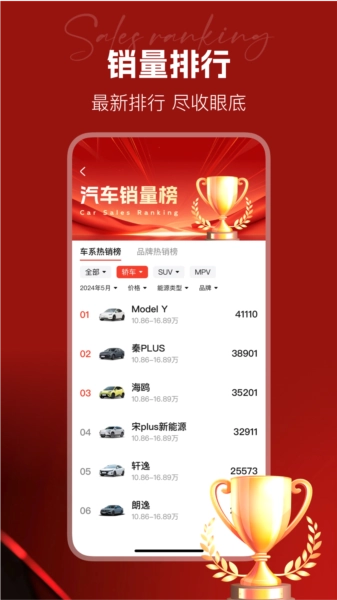 3、实时销量排行榜:可随时掌握汽车市场的热销动态,知晓当下哪些车型最受消费者喜爱。