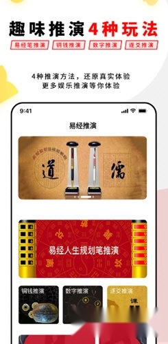 2、趣味推演玩法十分丰富,不仅设有易经推演中心,还提供了铜钱推演、数字推演、易经笔推等专门的演算区域。