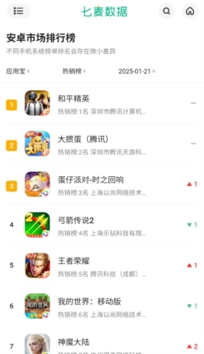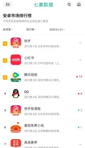七麦数据支持iOS和Android双平台榜单的实时查询,能全面掌握排名情况、变化趋势以及竞品榜单动态,并且数据更为精准、详尽。