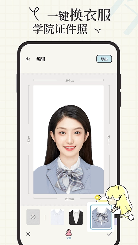 不仅提供职业西装、衬衫等正装,还有韩系、日系等学院风热门服装可更换。男装、女装、童装素材齐全。换装毫无违和感,证件照也能美美C位出道!