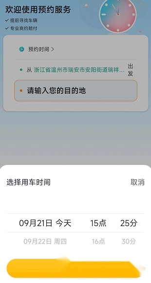 2、选择用车时间并确认目的地。