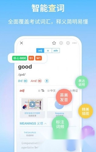 标注词频方面,该词典标注了“朗文交际9000词”以及口语、书面语常用的3000词,其中核心3000词与初高中新课标词汇高度契合,是市面上唯一对口语、书面语核心词汇进行分级的词典品牌。