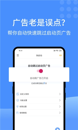 快启动App是一款能自动跳过开屏广告的广告过滤工具。有了它,您可以轻松略过应用的起始页面,快速进入主界面。每次打开应用都弹出广告是不是很让人困扰?要是不小心点错了广告,用快启动App就能帮您解决这些烦恼。
