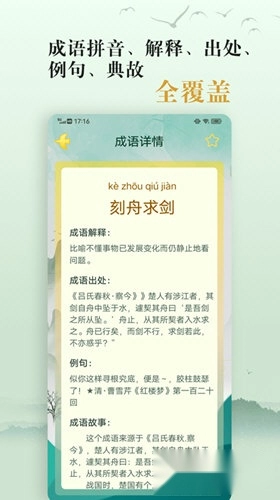 4、在趣味体验中传递知识、启迪思维,帮助用户积累国学素养。此外,软件成语大词典功能,收录了30000余条成语,涵盖词汇本身、详细释义、来源典故及拼音标注等丰富内容。