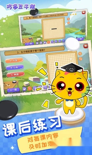 每节课结束时,我们会用儿歌总结的形式,帮助孩子轻松又有趣地记住课程重点,再搭配课后练习,让他们复习和巩固所学知识。另外,还有五子棋人机对弈功能,能让孩子把学到的内容用起来。
