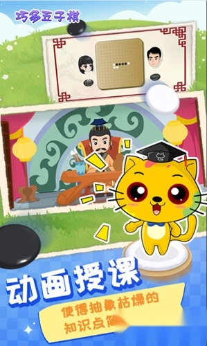 教学内容通过人物互动的形式展开,生活化的对话搭配动画的呈现方式,亲切自然,让抽象枯燥的五子棋知识在潜移默化中被孩子轻松接受和理解。