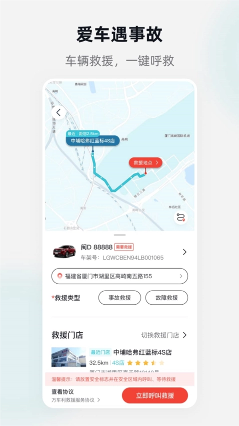 当车辆出现故障时,用户可点击SOS一键救援按钮,获取一站式救援服务。