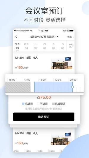支持线上预订会议室,只需选择日期和时间段并提交订单即可。