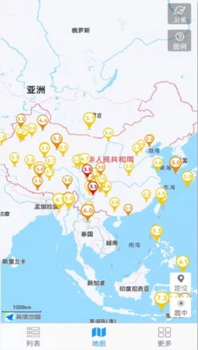 3、地震列表中的所有地震都能在地图上进行定位,震级大小与发震时刻可通过标注符号来区分。