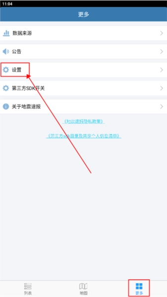 1、进入地震速报,在“更多”页面,点击“设置”;