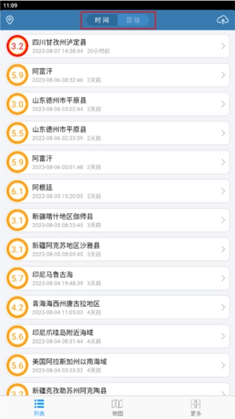 1、在地震速报的“列表”页面,找到你想查看信息的地区,可依据时间和震级进行查找;