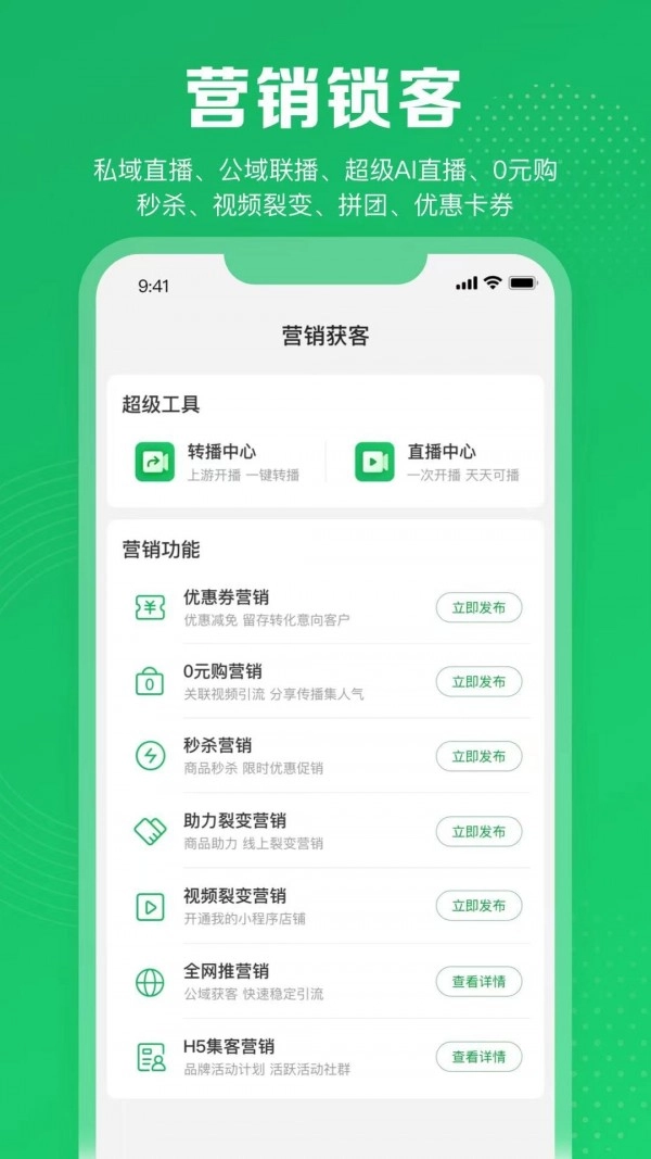 私域直播、公域联播、超级AI直播、零元购、秒杀、视频裂变、拼团、优惠卡券。