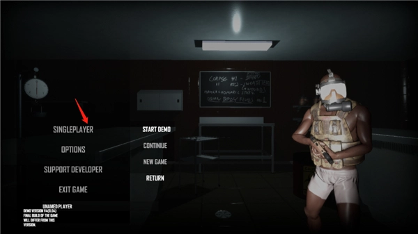 1、打开scum人渣手机版国际版,稍等几秒让游戏完成加载,随后正式进入游戏首页。在首页点击“单人游戏”,该选项下有游戏演示、继续和新游戏这几个功能,我们选择点击“开始演示”。
