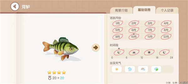 梅花鲈:获取地点,地图上的所有湖中均可钓到。获取时间,全天0~24。