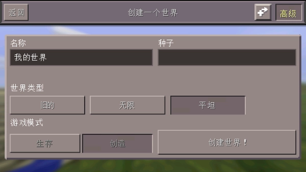 6、在高级设置中你可以选择世界,有旧的、无限、平坦供你选择,之后点击创建世界即可进入游戏;