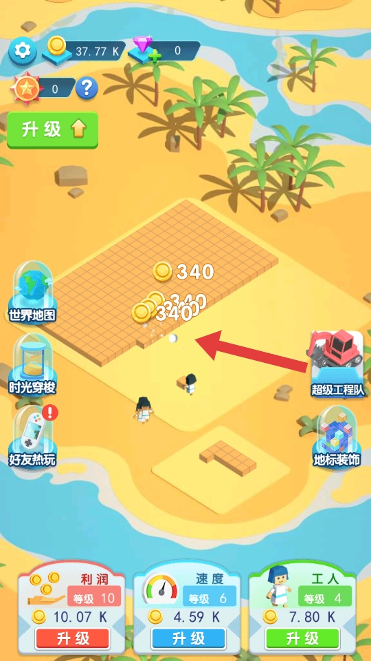 3、持续用金币升级利润,增加资源获取效率,循环升级工人→选地块建房→升级速度流程,填满方舟网格。