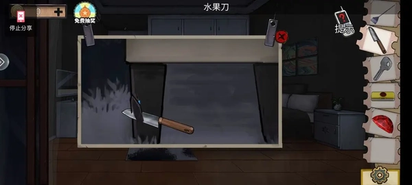 请点击位于沙发右侧的小柜子,然后从中拿出水果刀。