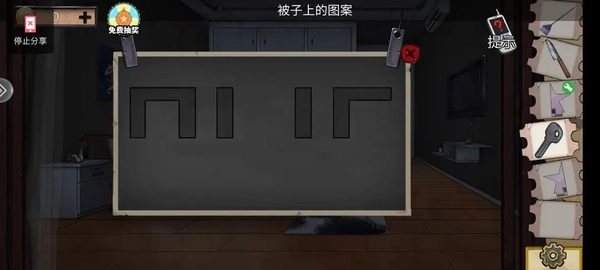 与左边房间被子上的图案相结合,能够得出“ALIC”,这便是解开左边房间左边床头柜的密码。