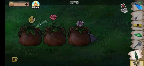 轻触落地窗,步入花园。拿起左边的钥匙,打开左边柜子上的锁,从中取出营养剂。