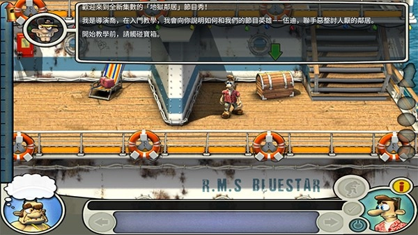 首先,把压缩气瓶安装到小孩的喇叭上,接着再取一个压缩气瓶。让老头从左上角离开,之后又回到左上角,把芳香丸放入老头吃的糖果里。用铁锉将厕所的标识进行调换,随后把铁钩装在鱼竿上。前往左下角,用铁锉处理一下救生艇的绳子。来到右下角,把压缩气瓶放置在救生衣上,将灭火器和氧气瓶相互调换。等待合适时机,回到左上角给老头打电话(此时老头应该刚被灭火器整治完,正要开始上楼),任务完成。